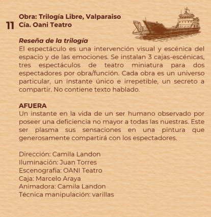 OANI Teatro presentará tres espactáculos de eatro Lambe Lambe que hacen parte de la Trilogía Libre: AFUERA, SABIDURÍA y HAMBRE, es una intervención visual-escénica del espacio y de las emociones. Se instalan 3 cajas-escénicas, tres espectáculos de Teatro miniatura. Cada obra tiene una duración de 4 minutos y se presentan para dos espectadores por función durante 2 horas continúas. En esta instalación el público asiste esperando su turno. Un instante único e irrepetible, un respiro y oda a la simplicidad.